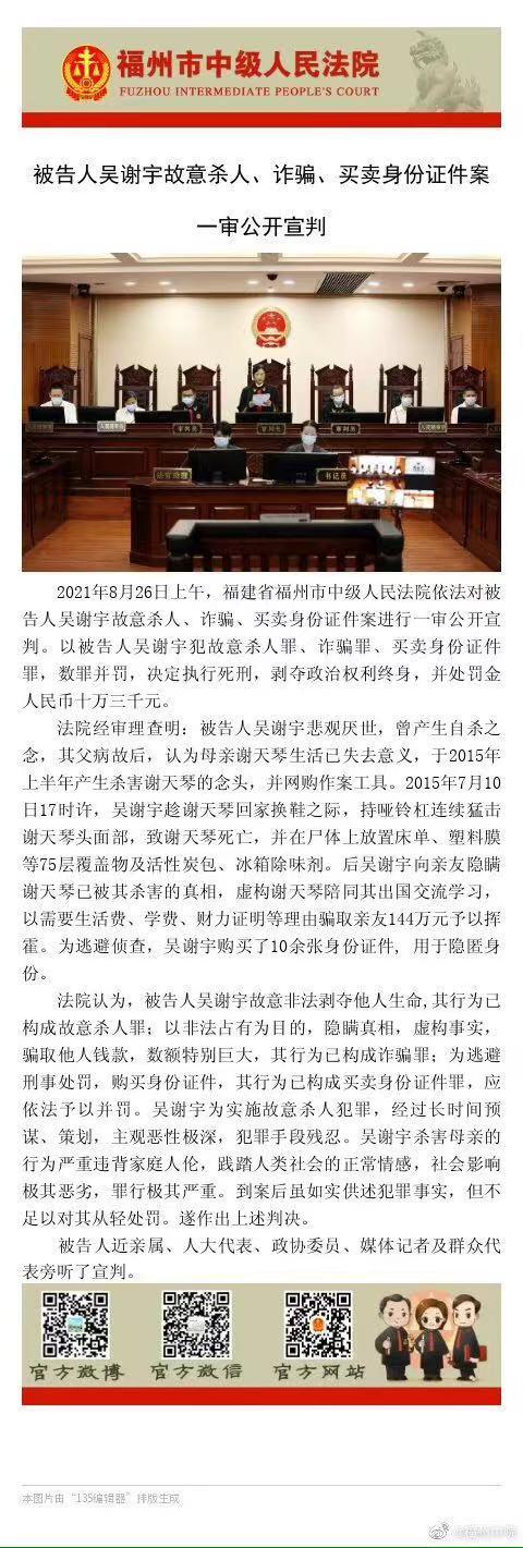 吴谢宇判决. 原标题双面吴谢宇 12月24日福州中院开庭审理吴谢宇案 检方指控2015年7月10日吴谢宇在家中将母亲杀害. 吴谢宇父亲的朋友沈之化名向新京报记者表示前来参加庭审的吴父朋友和家属曾希望不要判处吴谢宇死刑宣判后吴父朋友和家属均表示不满判决结果 吴谢宇家的前邻居告诉新京报记者法院宣判后全校教职工已得知吴谢宇被判死刑的消息大家. 法院判决被告人吴谢宇犯故意杀人罪诈骗罪买卖身份证件罪 数罪并罚 决定执行死刑剥夺政治权利终身.